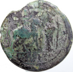 emperor on horseback advancing, right, holding reins and saluting, in front of Demeter standing, left, holding ears of corn and long torch |