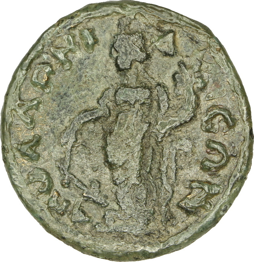 Tyche standing facing, head left, wearing kalathos, holding cornucopia and rudder