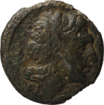 diademed head of Alexander the Great, right, with hanging hair; below, wreath