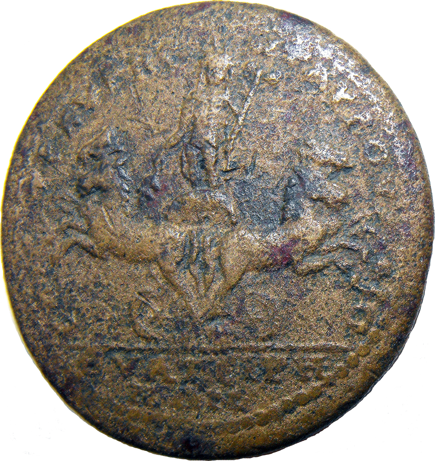 Apollo Tyrimnaios, radiate, standing facing on quadriga of horses seen from the front, holding laurel branch and double axe |