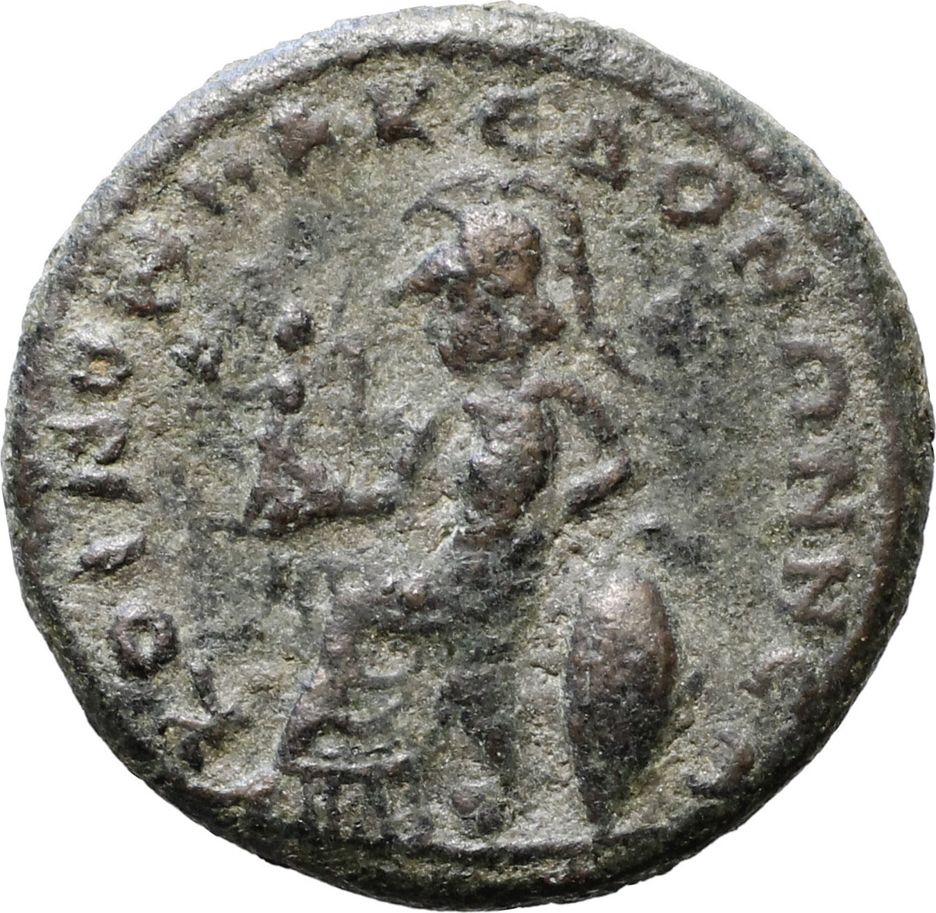 Athena seated, left, holding Nike; beside throne, shield