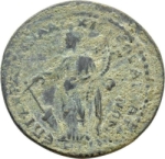 Tyche standing, facing, head left, wearing kalathos, holding rudder and cornucopia |