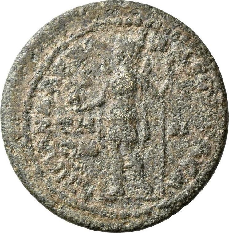 Mên standing, facing, head left, wearing Phrygian cap and crescent on shoulders, holding spear and pine cone |