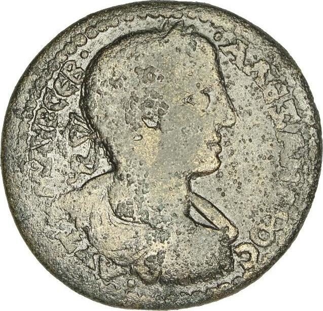 Tyche standing facing, head left, wearing kalathos, holding rudder and cornucopia, before Kore standing facing, having supports of corn and poppy on either side; above, between them, bucranium with wreath