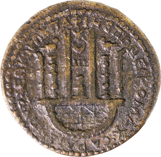 front view of the temple of Aphrodite of Paphos enclosing sacred stone with crescent and star between columns surmounted by doves and torches |
