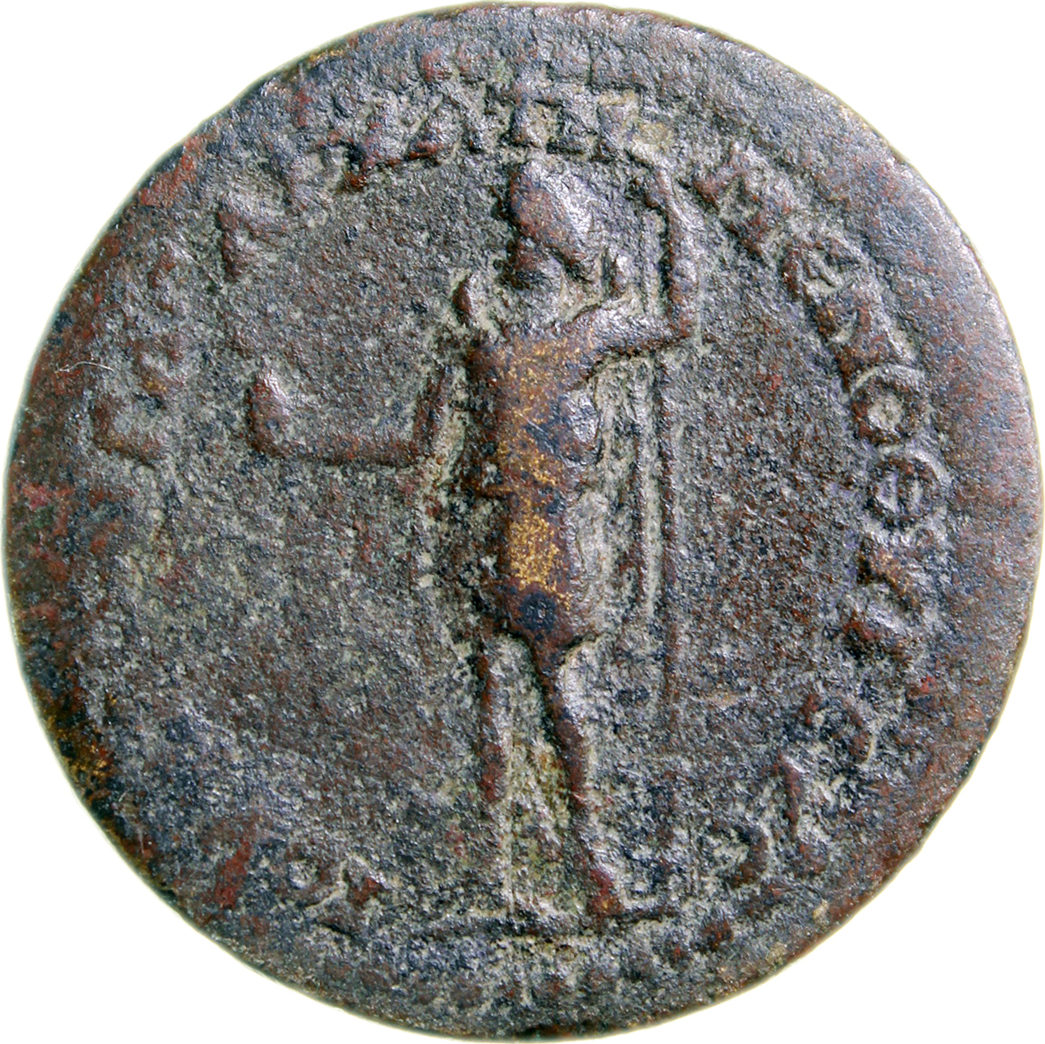 Mên standing facing, head left, wearing crescent on shoulders, holding spear and pine cone |