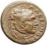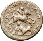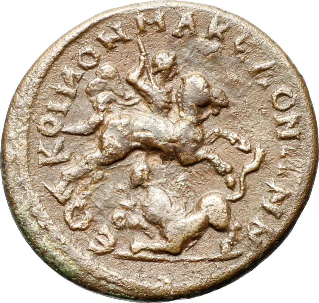 Alexander the Great riding Bucephalus galloping right, his mantle floating behind him, hurling spear at lion