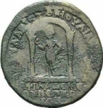 front view of arched shrine with two columns, within which Aphrodite standing facing, head left, holding apple in right, left hand on her hip |