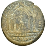 front view of temple with four columns with arcuated lintel, within which statue of the Emperor(?) standing right, holding transverse sceptre and globe |