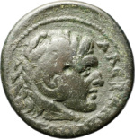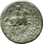 Alexander the Great riding Bucephalus galloping right, his mantle floating behind him, raising hand; below, star