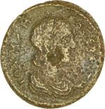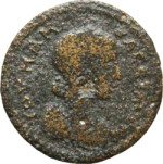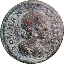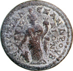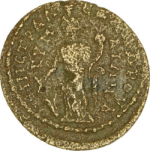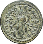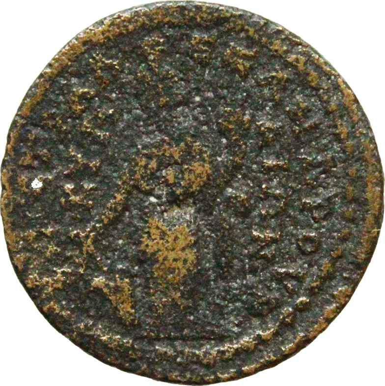 Tyche standing, left, wearing kalathos, holding rudder and cornucopia |