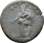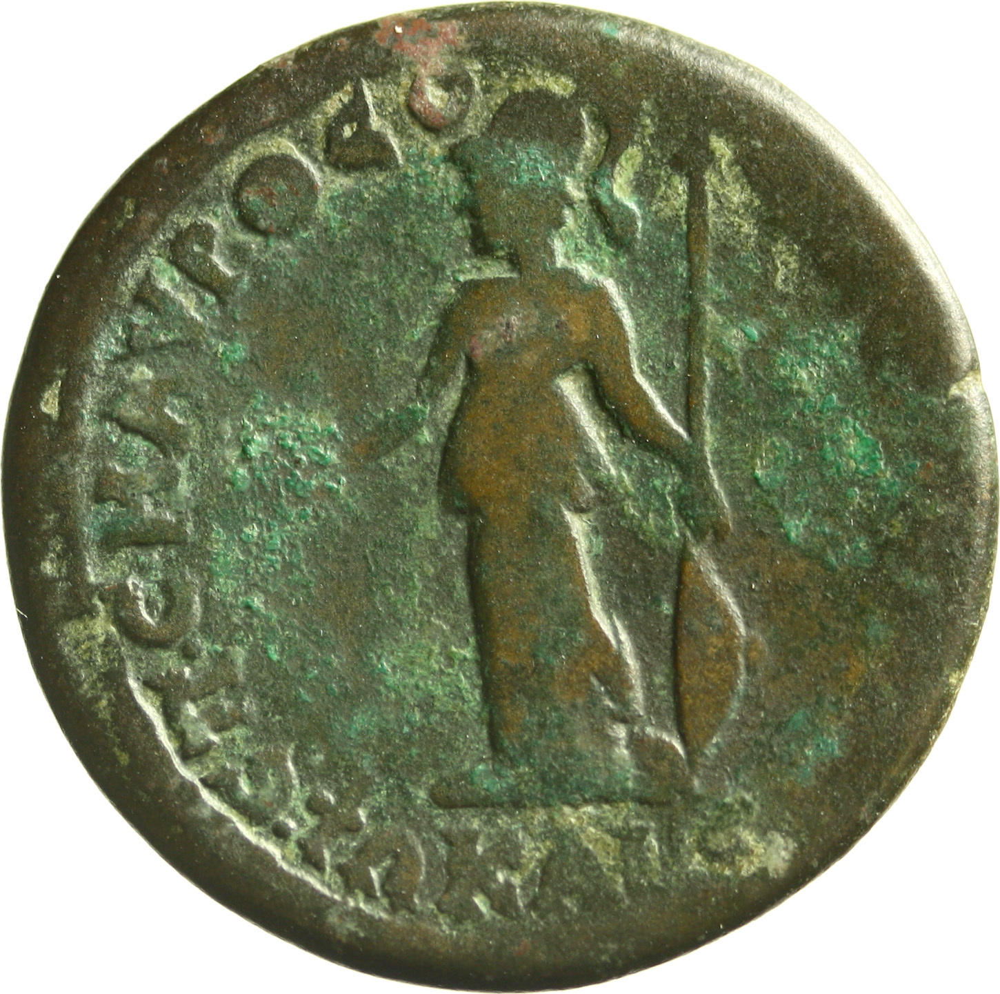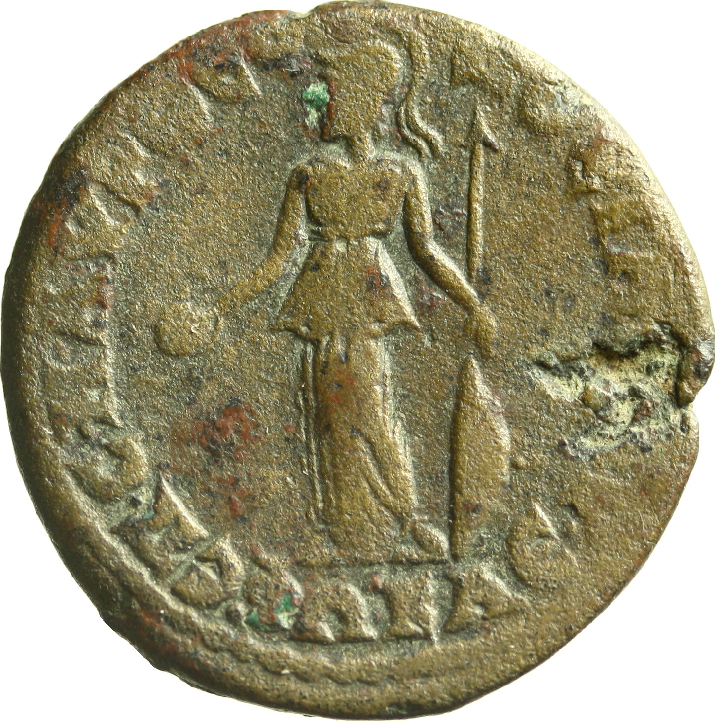 Athena standing facing, head left, holding spear and patera; behind, shield |