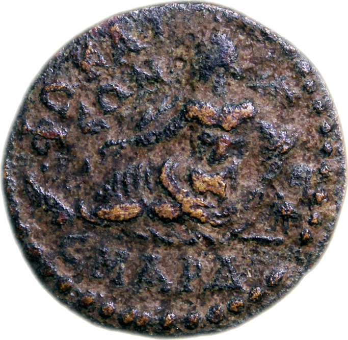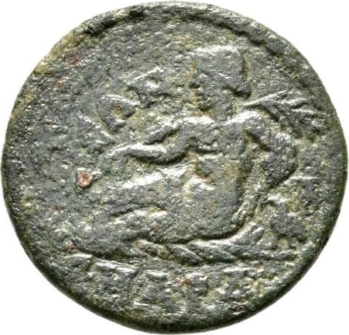 river god Smardos reclining, left, holding reed and resting on vase(?); behind, bird, left