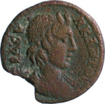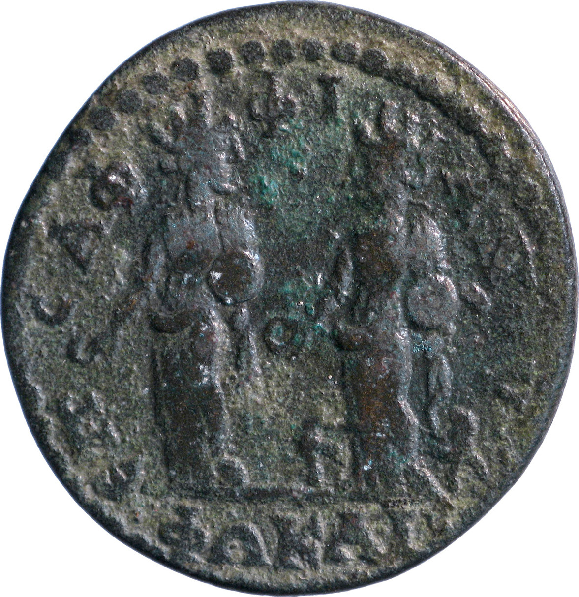 city goddess standing facing, holding patera, looking r, towards Cybele, standing facing, head left, flanked by two lions, holding patera