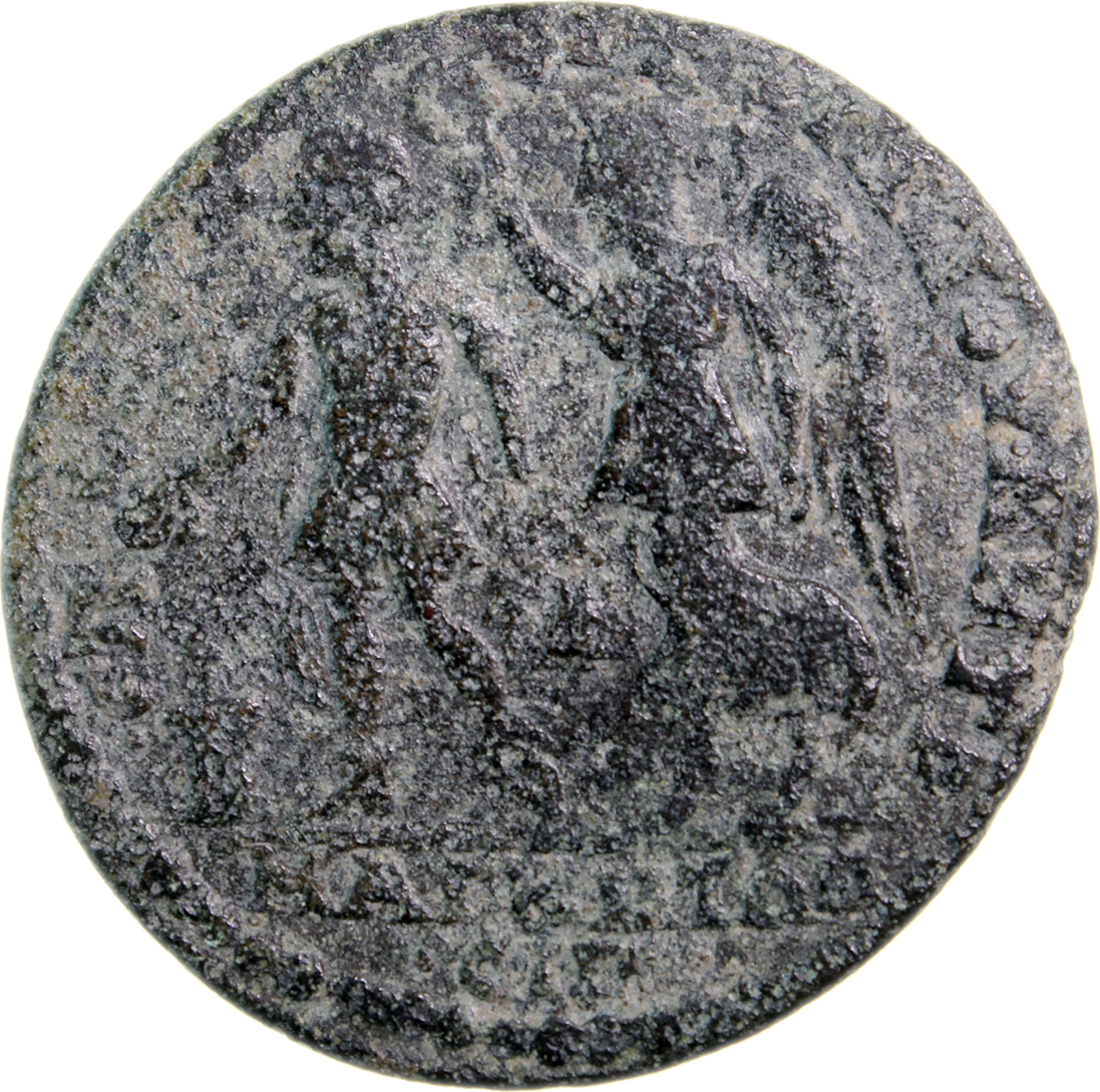emperor standing, left, in military dress, holding patera over altar, and Nike standing, left, beside him, placing wreath over his head |