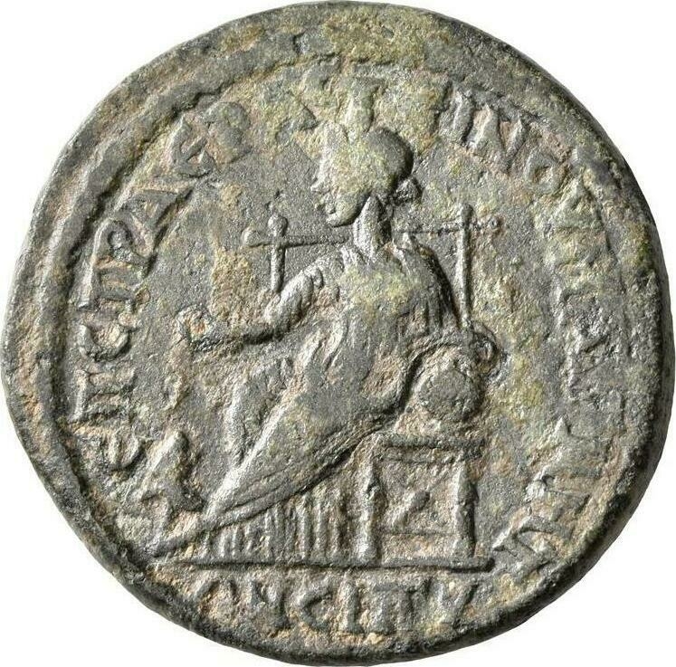 Cybele seated on throne, left, wearing polos, holding patera and leaning elbow on tympanum; at her feet, lion, left |