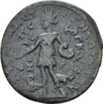 amazon Smyrna standing facing, head left, holding double axe and pelta with chlamys, and small temple with four columns; at her feet, prow |