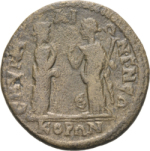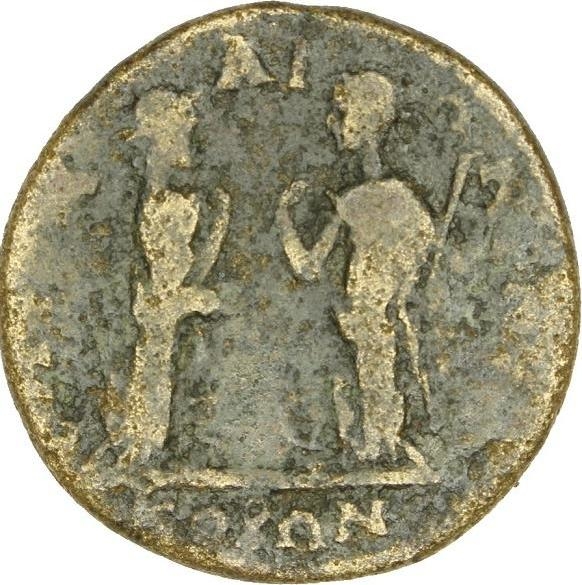 two Nemeses standing, facing, the one on the left holding bridle, the one on the right cubit rule; at her feet, wheel
