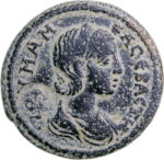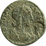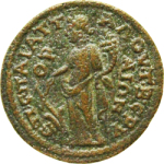 Tyche standing facing, head left, wearing kalathos, holding rudder and cornucopia |