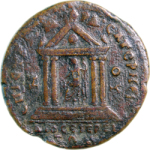 front view of temple with four columns, within which Zeus seated on throne, left, holding patera and long sceptre; globe in pediment |