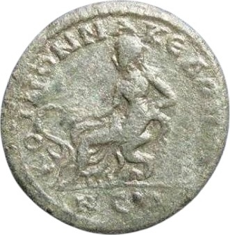 Olympias as Hygieia seated left, feeding serpent from patera, resting on throne