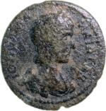 Emperor(?) in military dress standing facing, head right, resting on long sceptre, and Boule(?) standing facing, head left, holding long transverse sceptre, clasping hands