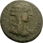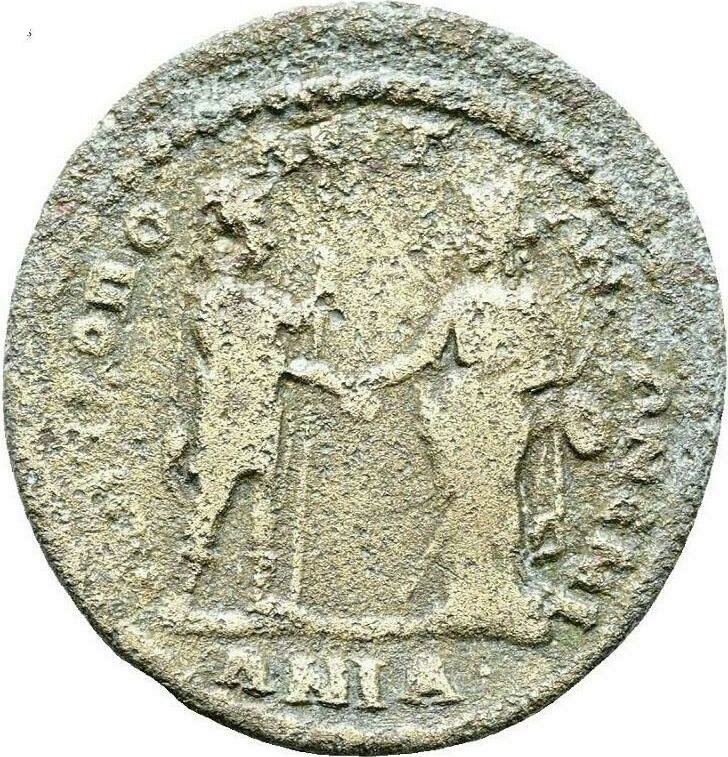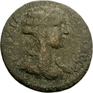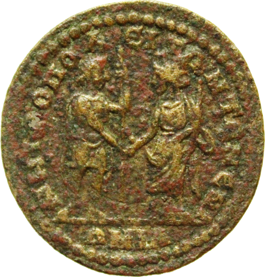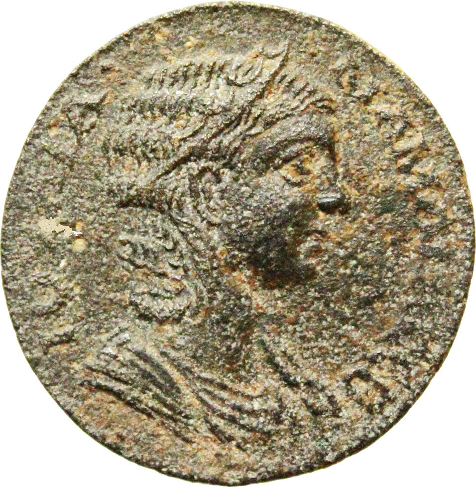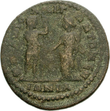 Emperor(?) in military dress standing facing, head right, resting on long sceptre, and City goddess standing facing turreted, head left, holding small sceptre, clasping hands