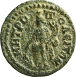 Tyche standing facing, head left, wearing kalathos, holding rudder and cornucopia
