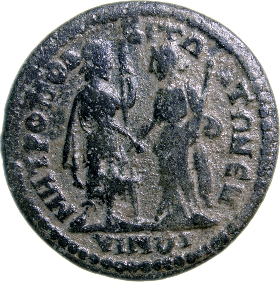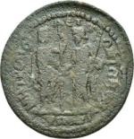 the Emperor(?) in military dress standing facing, head right, resting on long sceptre, and Boule(?) standing facing, head left, holding small sceptre, clasping hands