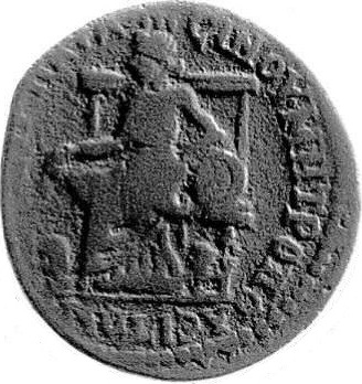 Cybele seated on throne, left, holding patera and leaning elbow on tympanum; at her feet, lion, left |