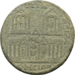 frontal view of two temples with two columns, above, and two temples with two columns seen in perspective, below, each holding cult-statue; the ones above having Artemis of Ephesus, to left, and the Emperor, to right
