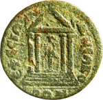 front view of temple with four columns, within which Artemis of Ephesus standing, facing, wearing kalathos, having supports