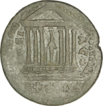 front view of temple with six columns, within which Artemis of Ephesus standing, facing, wearing kalathos, having supports |