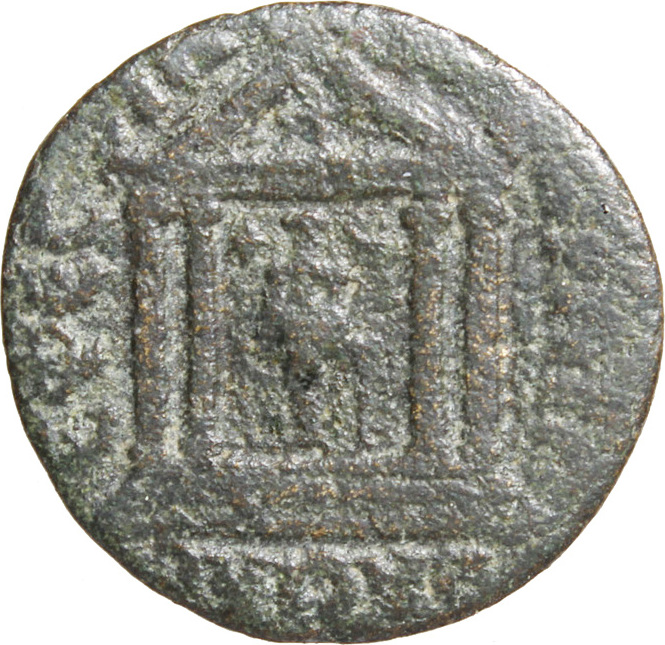 front view of temple with four columns, within which Artemis of Ephesus standing, facing, wearing kalathos flanked by star and crescent, having supports