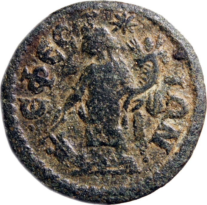 Tyche standing facing, head left, wearing kalathos, holding rudder and cornucopia; above or below, star