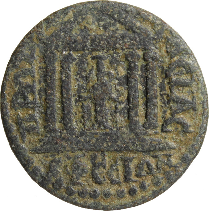 front view of temple with four columns, within which Artemis of Ephesus standing, facing, wearing kalathos, having supports; sometimes, globe in pediment