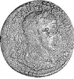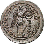 Victory standing, right, placing foot on helmet, inscribing round shield fixed on palm tree |