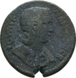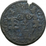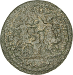 infant Dionysus seated on cista mystica, left, extending arms, between two Corybantes standing, facing, looking ate each other, holding shield |
