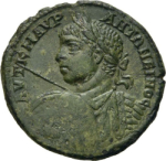 laureate, draped and cuirassed bust of Elagabalus, left, holding spear and decorated shield, seen from front