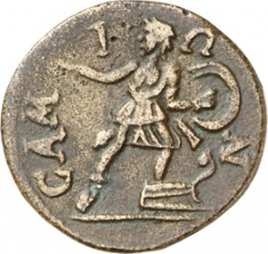 warrior advancing, right, looking back, holding shield and placing foot on prow, right