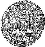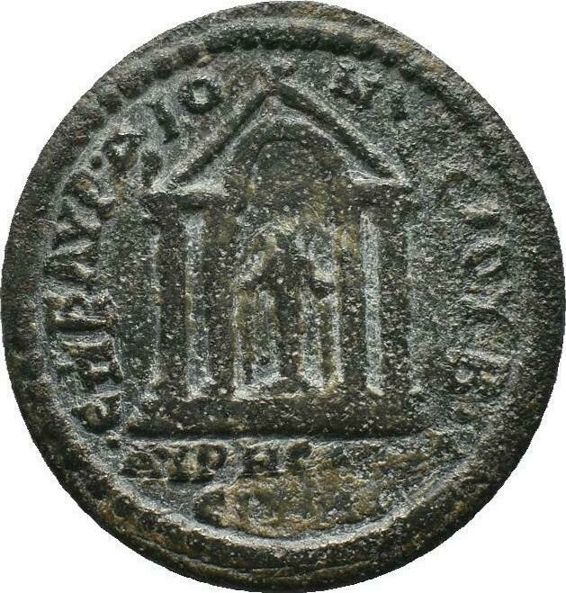 front view of temple with four columns with arcuated lintel, within which Artemis of Ephesus standing, facing, wearing kalathos, having supports |