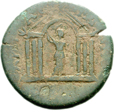 front view of temple with six columns with arcuated lintel, within which Athena standing, right, holding shield and spear
