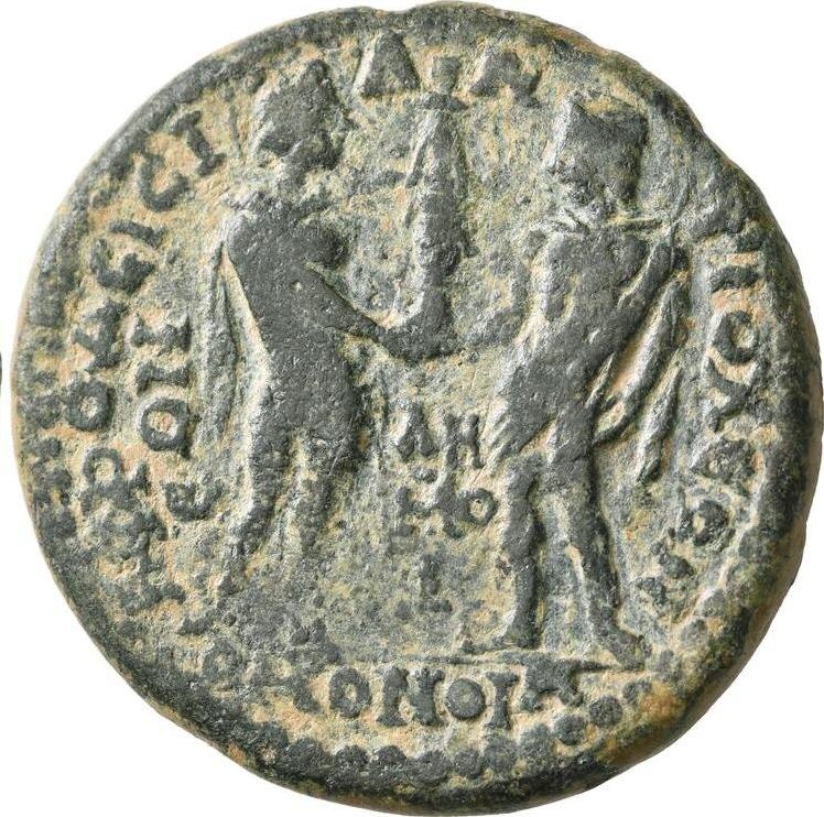 Demoi of Aphrodisias and Antioch standing, facing each other, each holding sceptre and supporting together a small cult-statue of Aphrodite of Aphrodisias(?), facing |