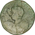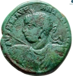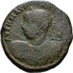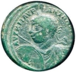 laureate, draped and cuirassed bust of Elagabalus, left, holding spear and decorated shield, seen from front