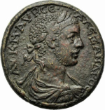 laureate, draped and cuirassed bust of Severus Alexander, right, seen from rear