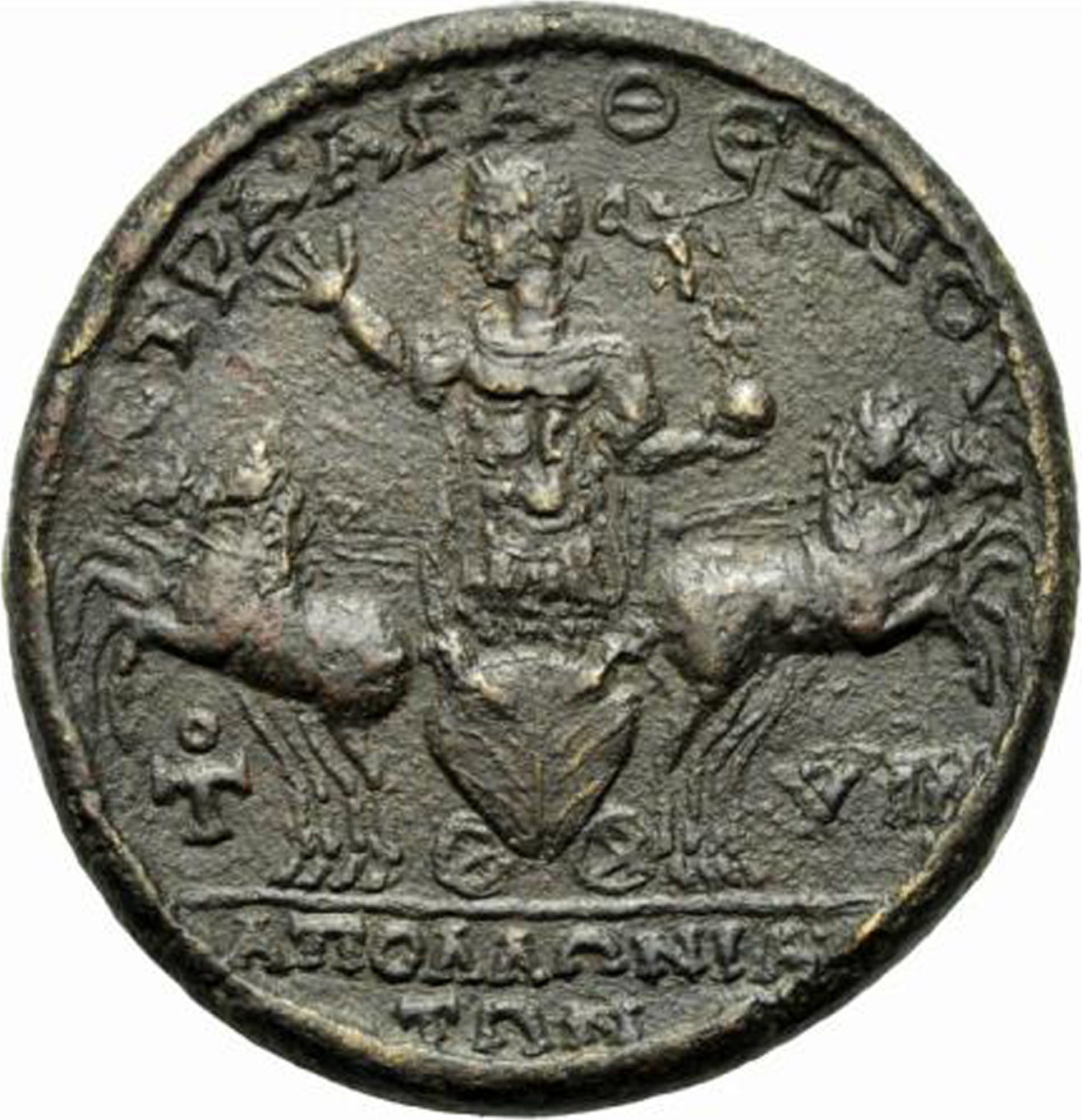 the Emperor standing facing on quadriga, head left, holding Nike on globe and raising right hand