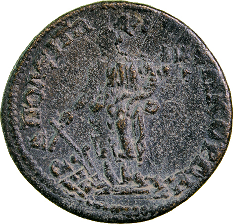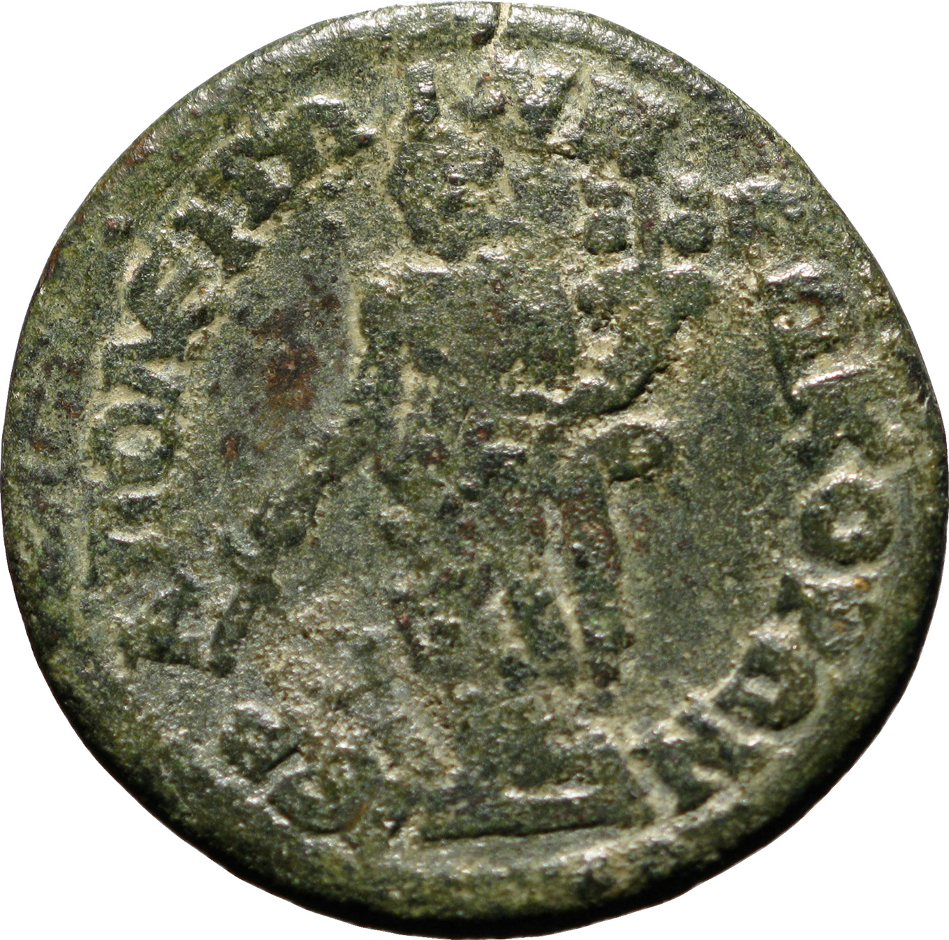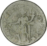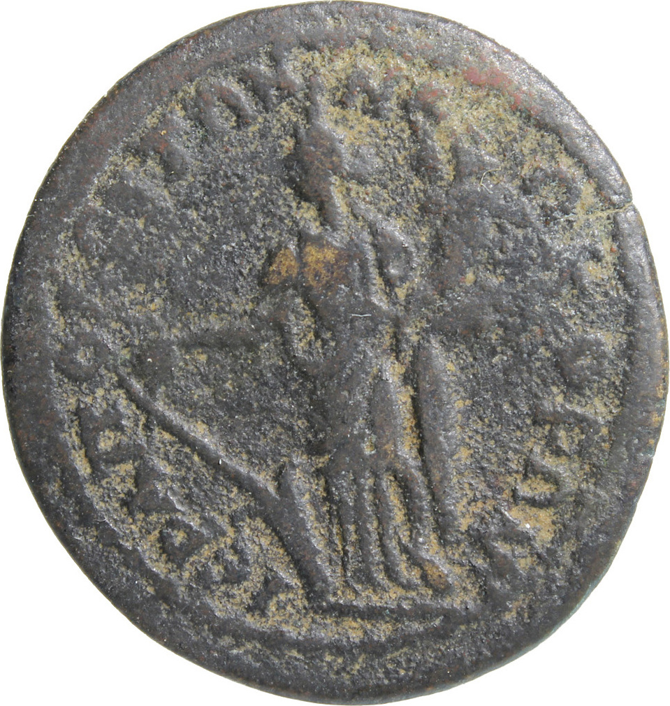 GIC 278 (Mên standing facing, head l., holding sceptre in l. hand and pinecone in r., Α in l. field, uncertain letter or character in r. field)