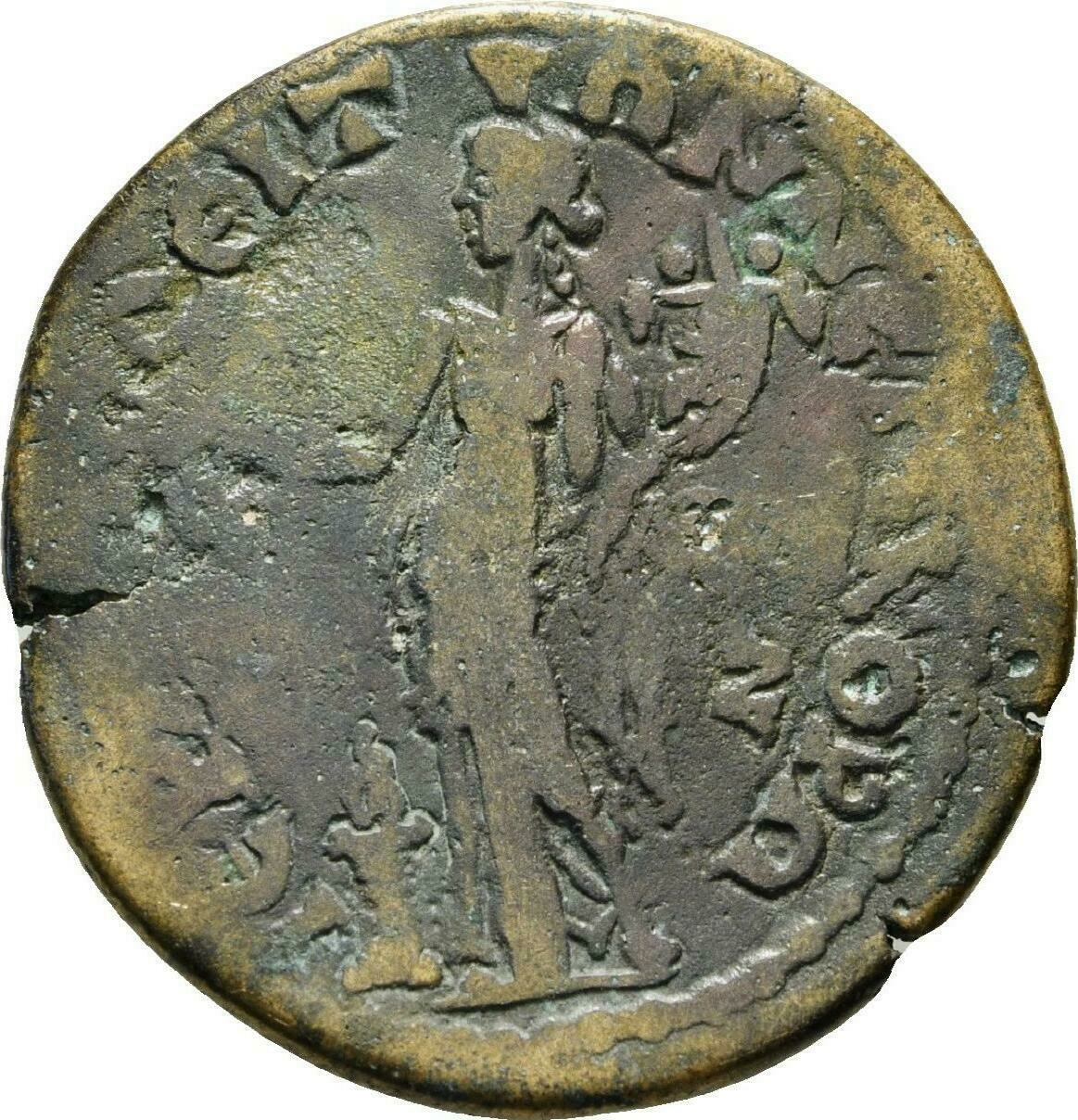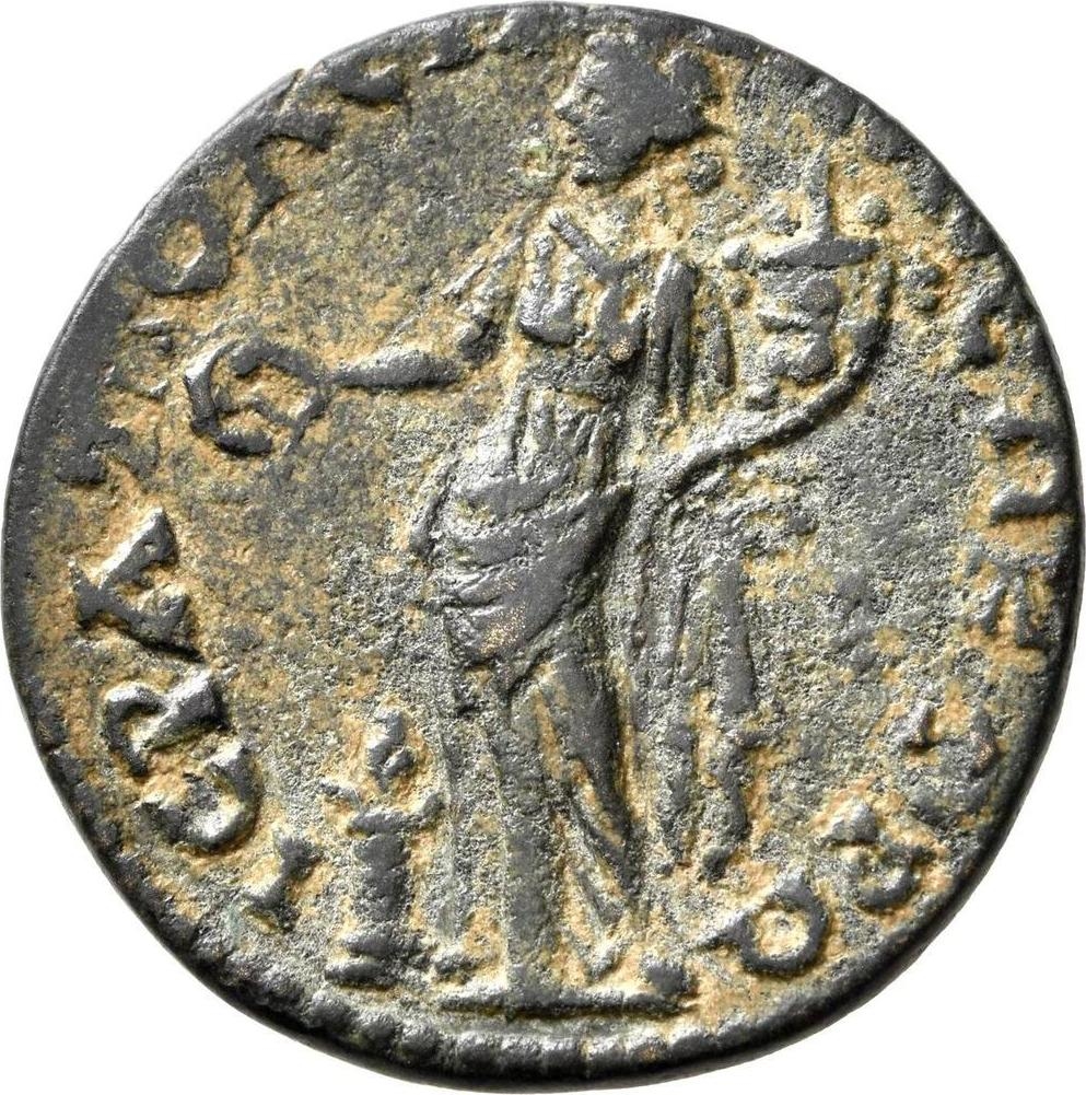 GIC 278 (Mên standing facing, head l., holding sceptre in l. hand and pinecone in r., Α in l. field, uncertain letter or character in r. field)