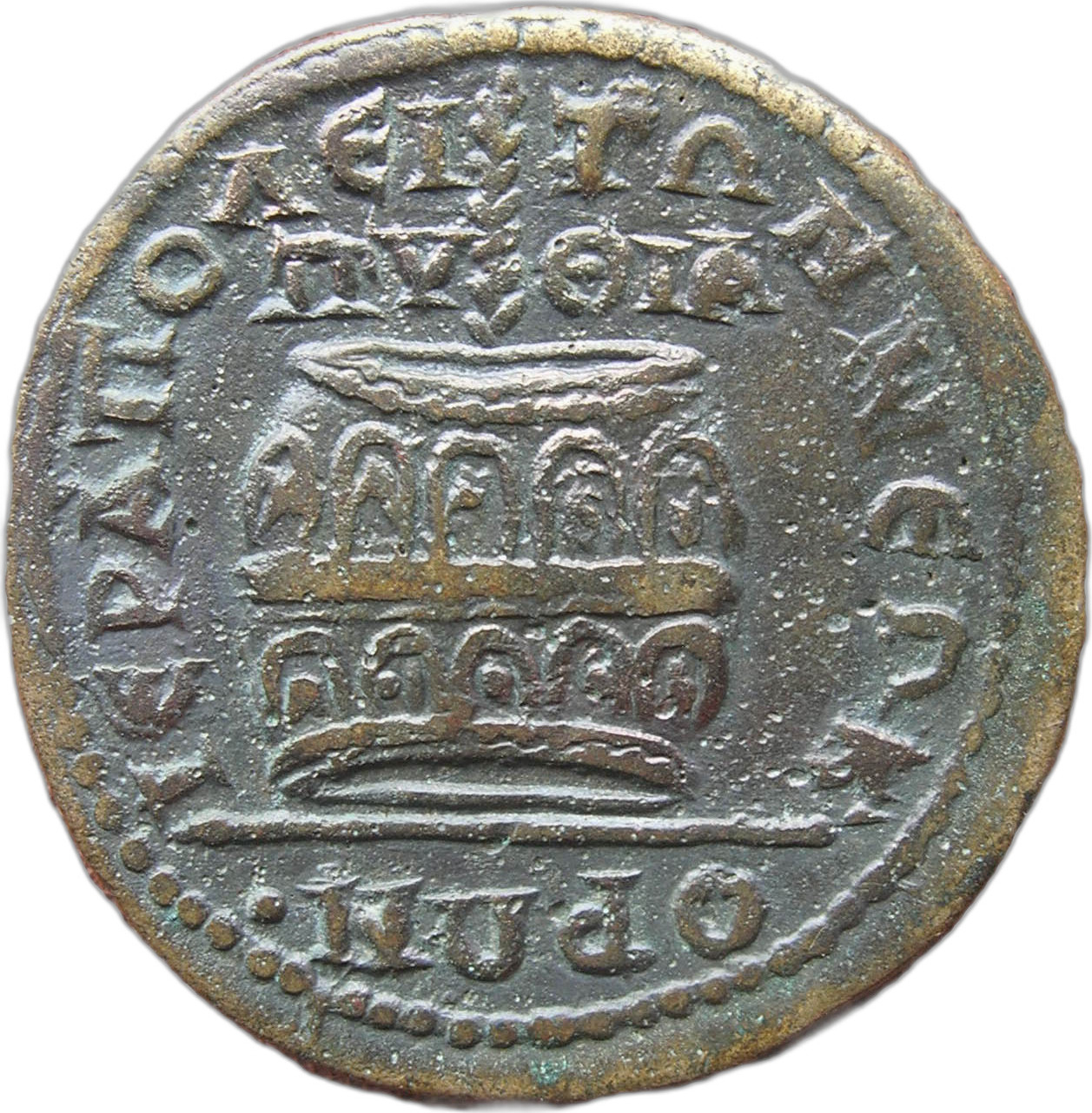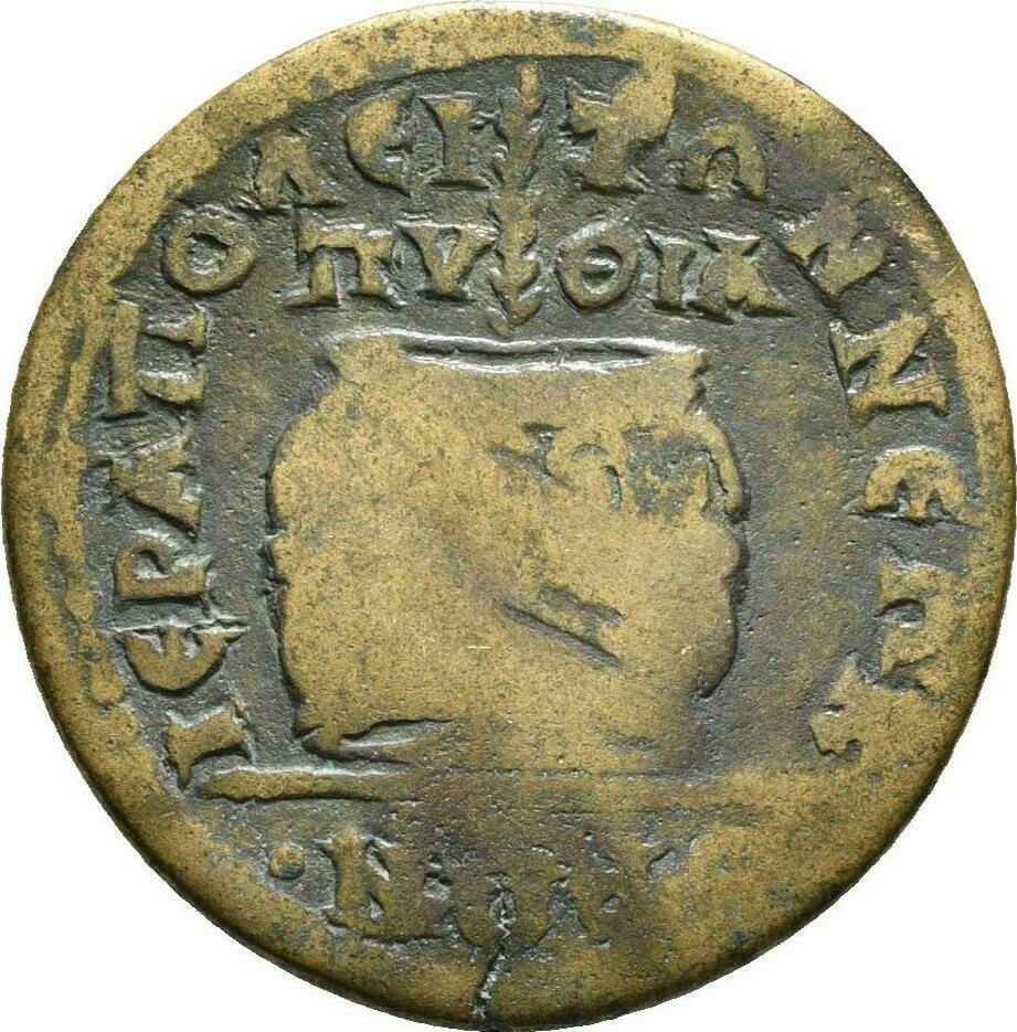 GIC 278 (Mên standing facing, head l., holding sceptre in l. hand and pinecone in r., Α in l. field, uncertain letter or character in r. field)