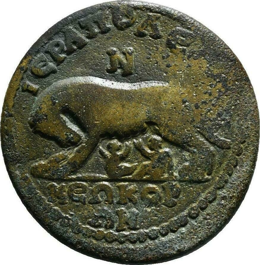GIC 278 (Mên standing facing, head l., holding sceptre in l. hand and pinecone in r., Α in l. field, uncertain letter or character in r. field)